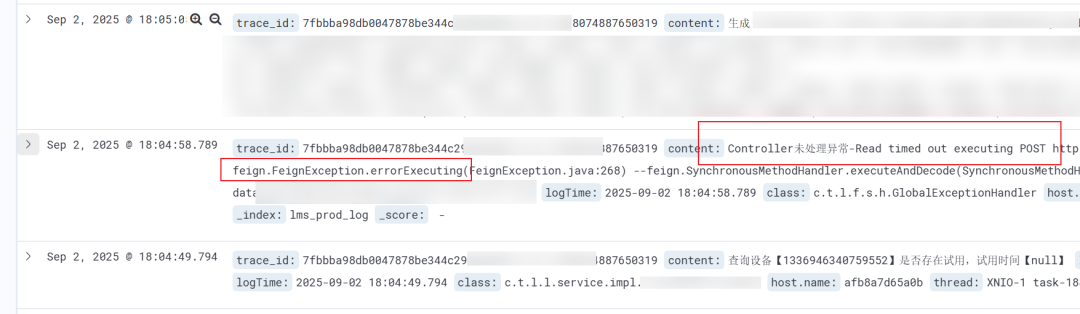 如果按照下面格式(trace id + ERROR)来搜索,就一定能发现关键的 feign 超时日志了。后续需要注意这个搜索技巧。