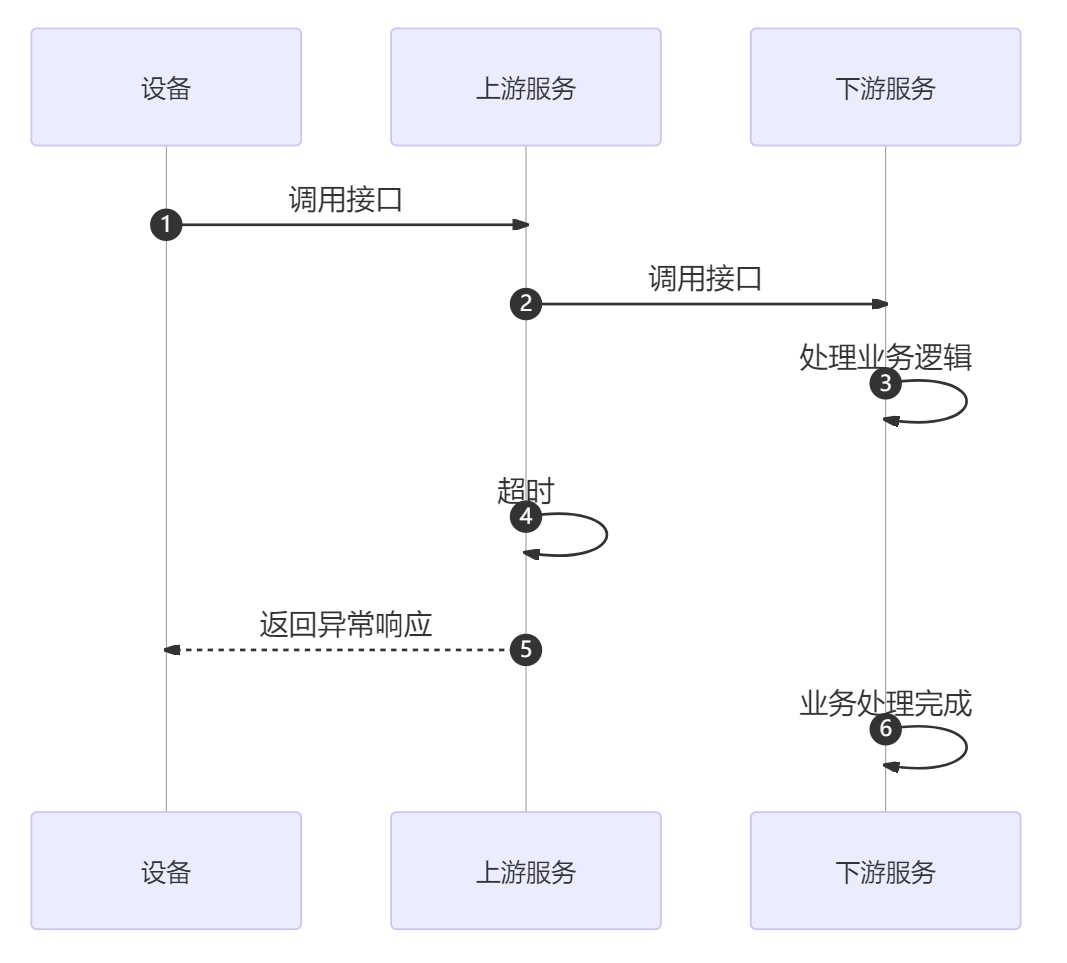 如下图所示,第④步上游服务超时了,下游服务还未执行完,上游服务就返回异常结果给设备了。