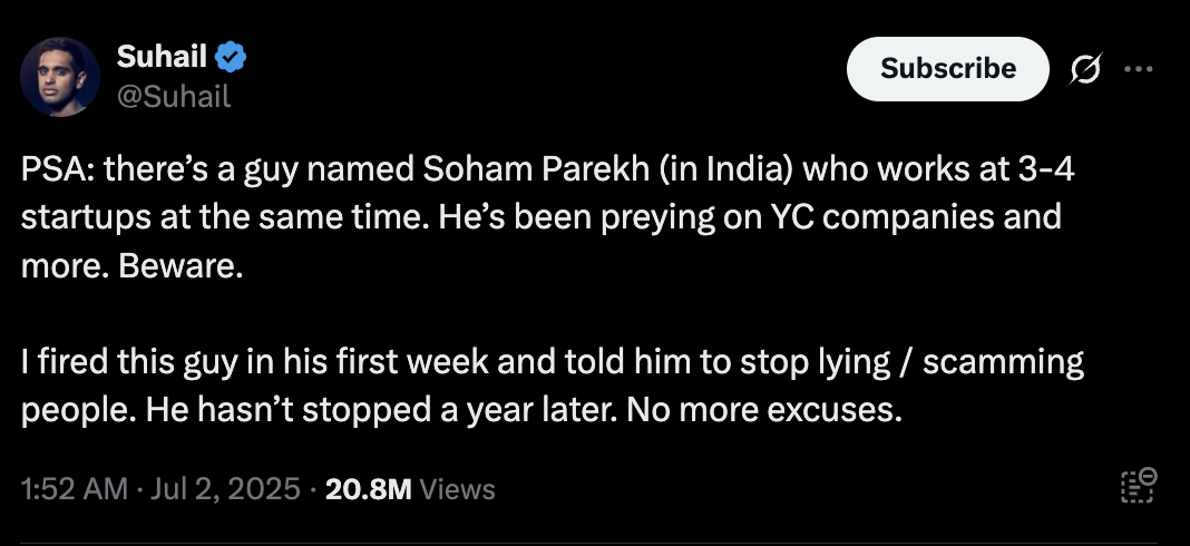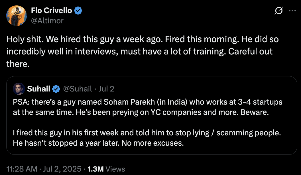 7 月 2 日,Playground AI创始人Suhail Doshi在X发帖称,这位名叫Soham Parekh的印度工程师,疑似使用了伪造简历和虚假的签证信息,同时为3至5家初创公司工作,骗取多个雇主的信任与多份薪水。
