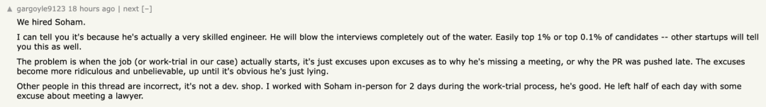 一位自称曾雇佣过Parekh的用户在Reddit上回忆说,面试时的他几乎完美,给人的感觉像是那种站在技术金字塔顶尖、属于前1%甚至0.1%的工程师。但一旦进入实际工作阶段,他就开始不断找借口推脱任务,交付一拖再拖。这些理由起初还能说得过去,后来则越来越离谱,直到最后你不得不承认,他压根就是在撒谎。
