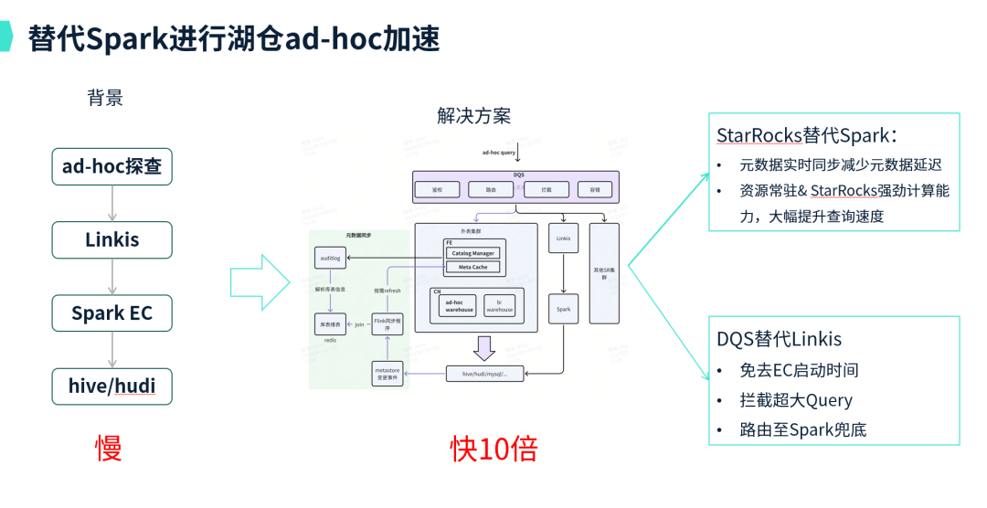 针对湖仓Ad-hoc查询效率低的问题,团队设计了全新的查询加速方案。首先通过Flink实时同步Metastore元数据至镜舟数据库,消除了传统架构中元数据获取的延迟。其次利用镜舟数据库的资源常驻能力,避免了每次查询都需要申请资源的开销。