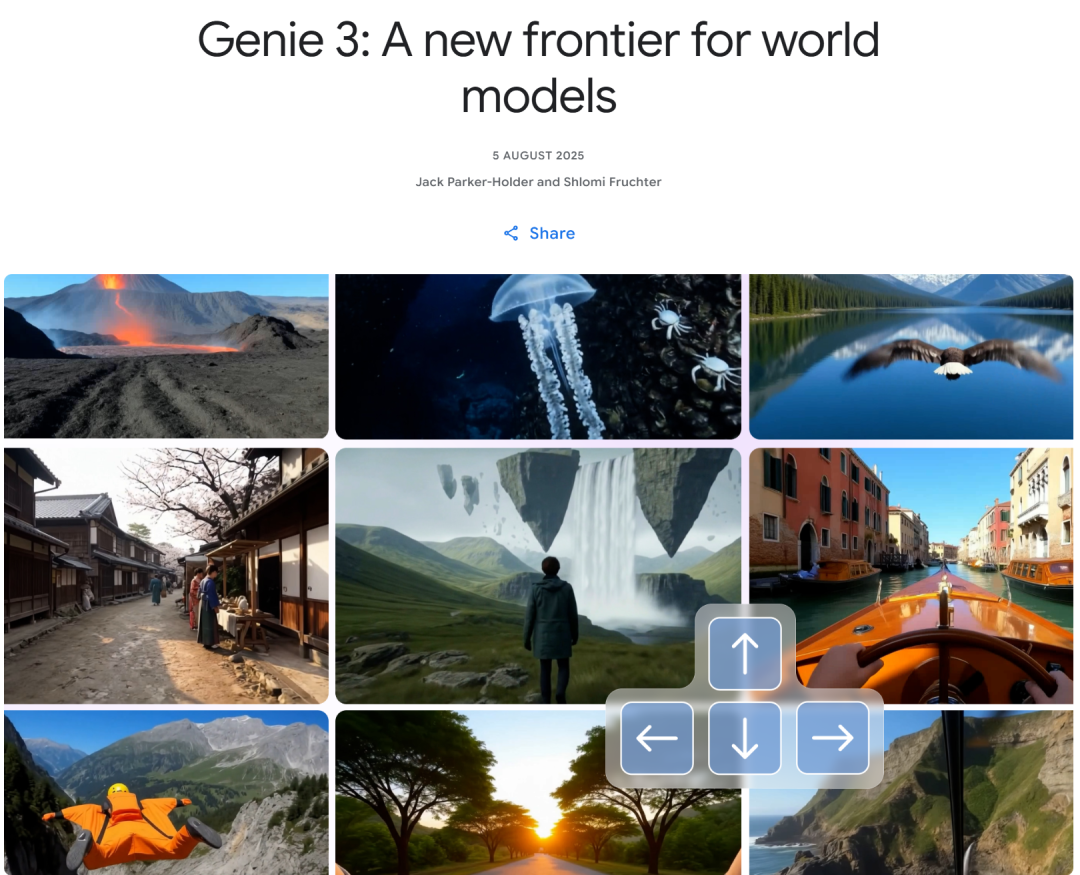 今年8月,DeepMind发布Genie 3,允许从自然语言直接生成三维、可操作的虚拟世界,用户能实时控制角色,与环境交互并观察反馈。