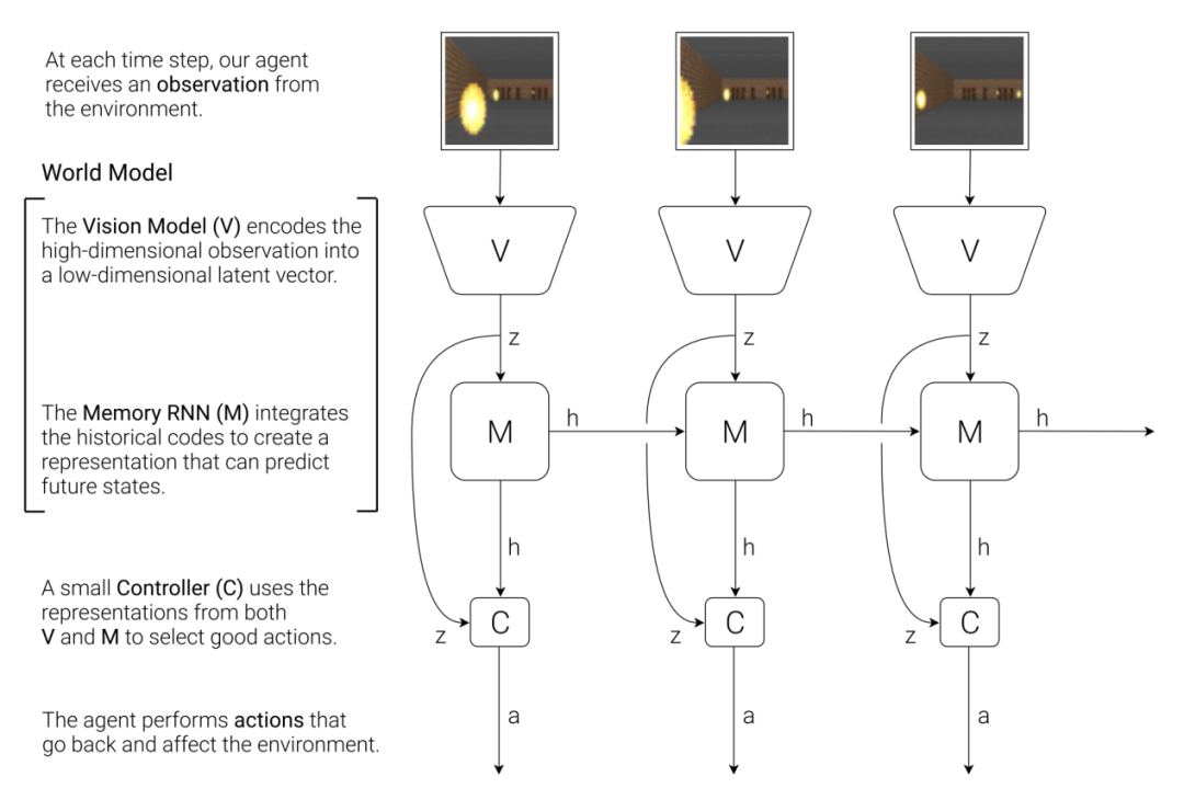 智能体包含紧密相连的三个模块:视觉 (V)、记忆 (M) 和控制器 (C)(来自World Models)