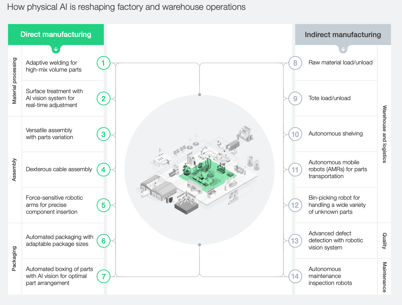 物理AI的应用不再局限于生产线上的某个孤立环节,而是贯穿于整个制造价值链——从原材料处理、精密装配到包装、内部物流、质量检测和设备维护。