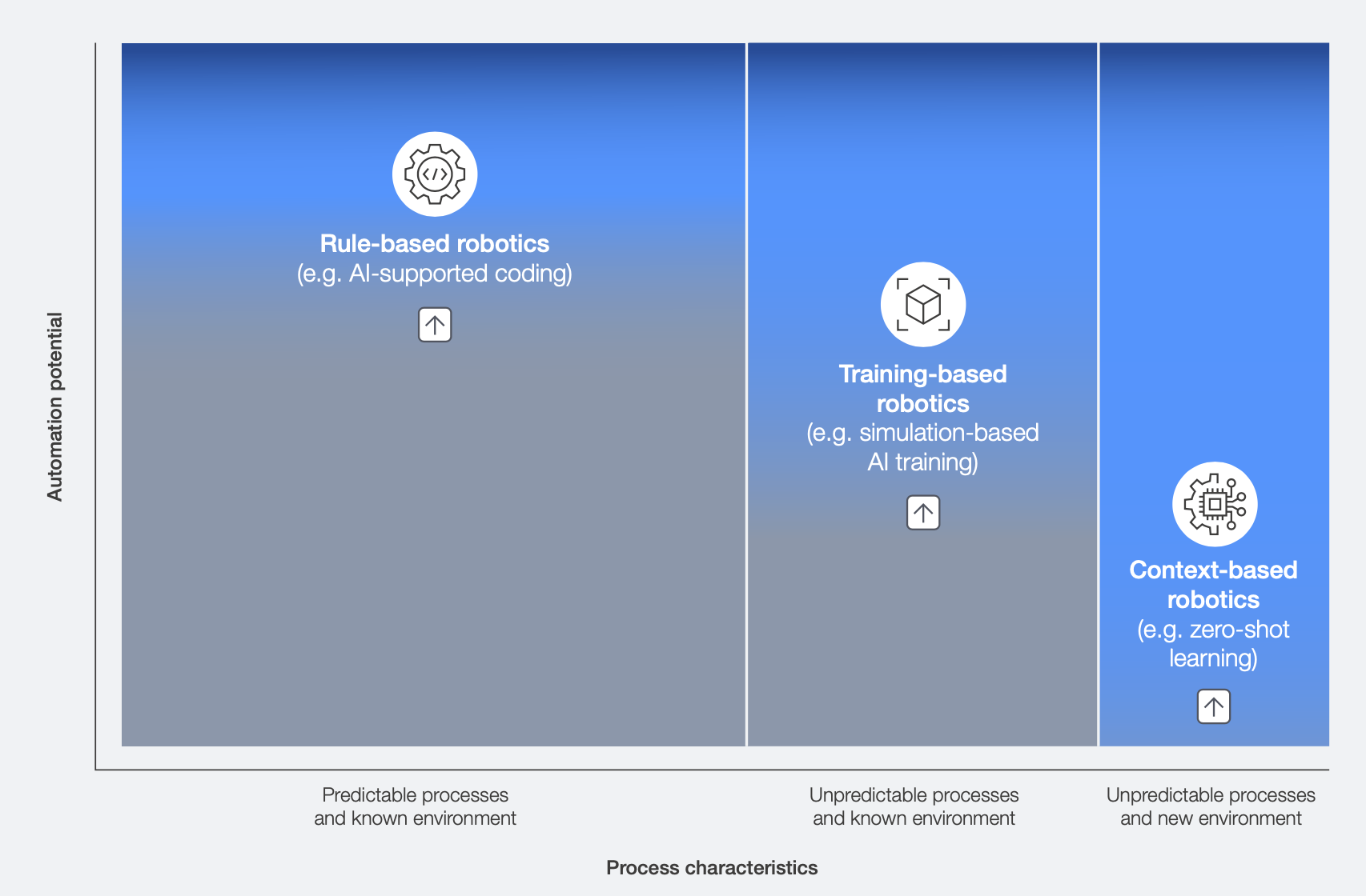3. 基于上下文的机器人(Context-based Robotics):这是物理AI的最前沿。利用机器人基础模型和零样本学习(zero-shot learning)能力,这类机器人可以在没有经过特定任务训练的情况下,自主感知、推理并行动,以应对陌生的场景。它们能够理解高层次的指令,并对真实世界的复杂性做出反应,特别适用于充满不确定性的环境,例如处理从未见过的零件或在新的工厂布局中工作。机器人基础模型是其认知核心,使得通用机器人(如人形机器人)能够在不同环境中灵活执行多样化任务而无需重新编程。