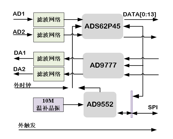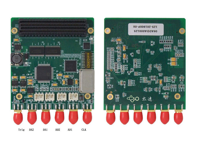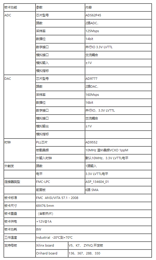 板卡可实现2路14bit 125Msps AD 和2路16bit 160MspsDA功能,FMC LPC连接器用于扩展到xilinx用于模拟信号、中频信号采集,信号发出等应用。
