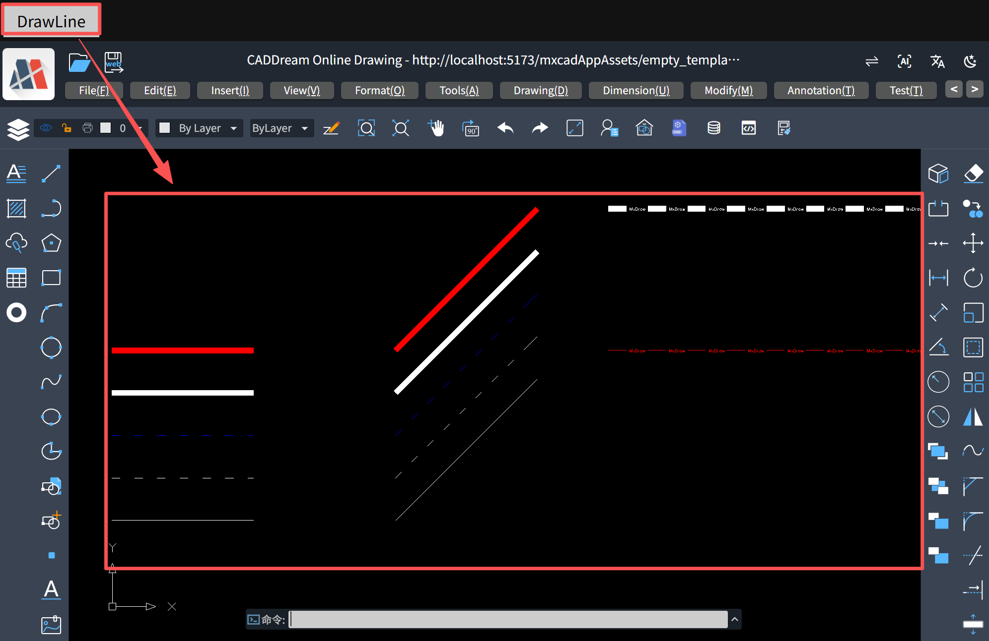 Based on the above operations, we have integrated the MxCAD project into our project and completed the initialization configuration. Next, we can directly conduct secondary development based on this CAD project. As an example, let's take the implementation of parametric drawing of multiple straight lines in the project. After achieving the drawing command in our own system, register it, and then call our command for drawing straight lines in the MxCAD project and execute the corresponding parameter operations.