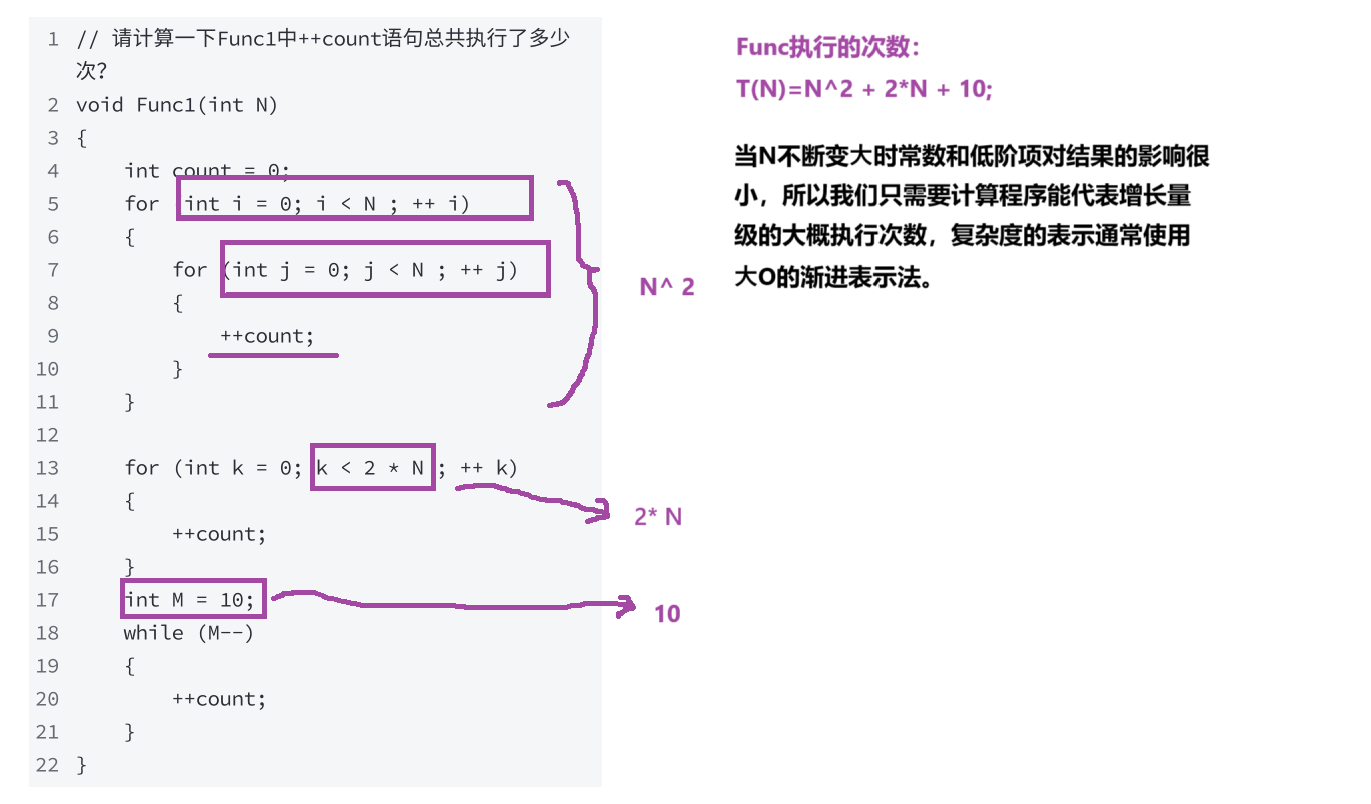 通过以上方法,可以得到 Func1 的时间复杂度为: O(N^2 )。
