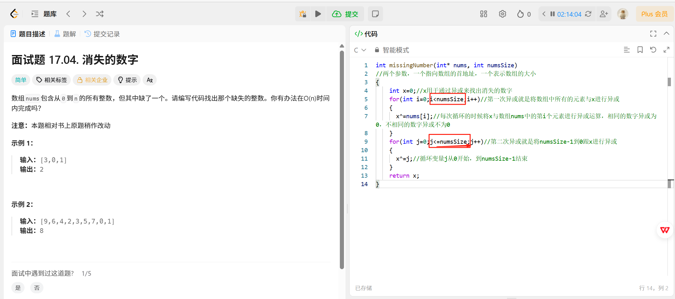 第二次异或的时候是将数组本应该有的元素从0到numsSize-1都跟x=0进行异或,j是作为数据用的。数据是0,1,2, 3 ----->用j 访问这些数据
