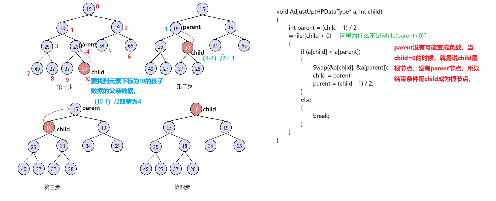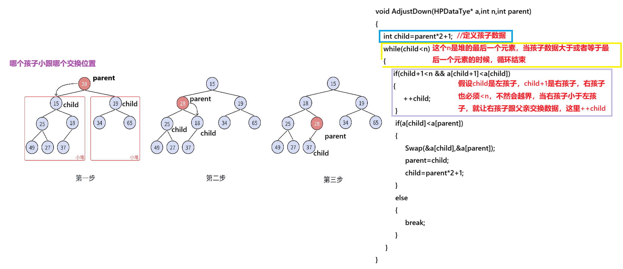 if (a[child] < a[parent])//小堆,父亲数据小于孩子数据,否则需要调整