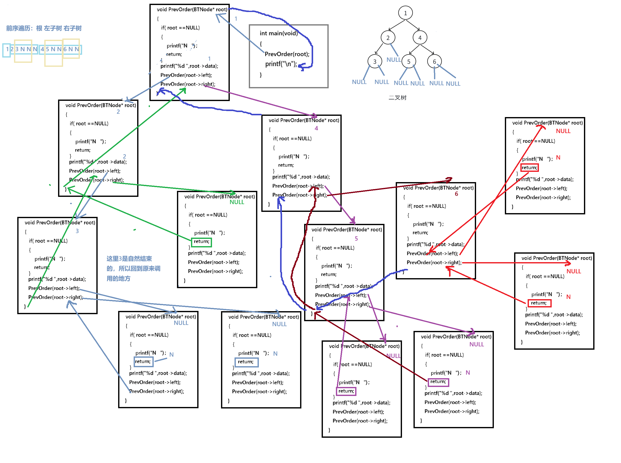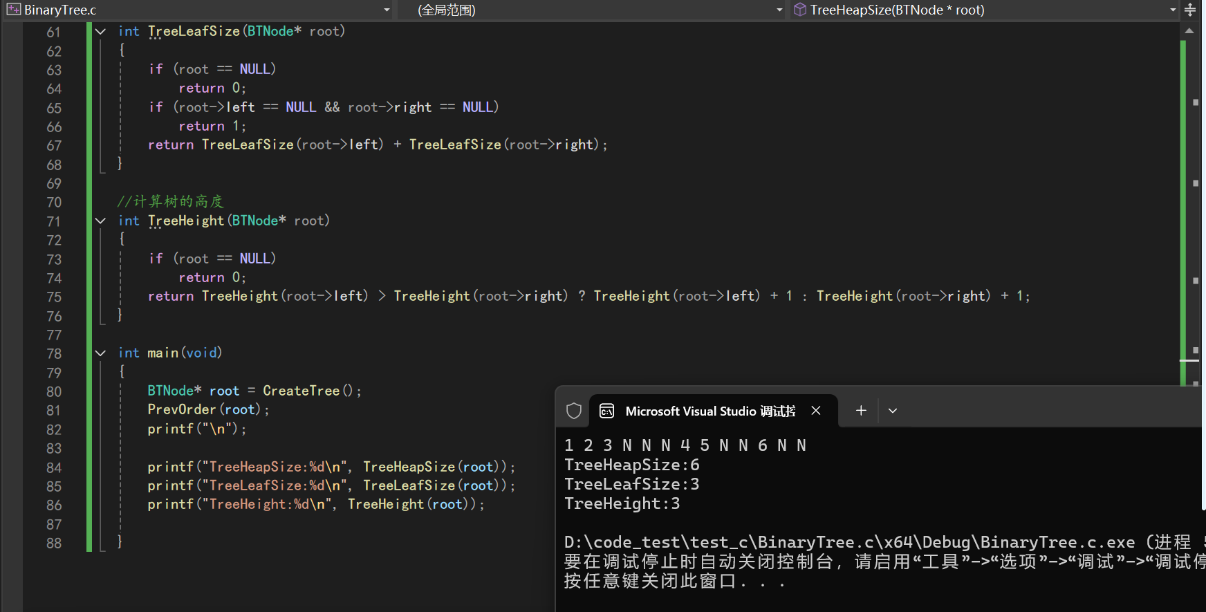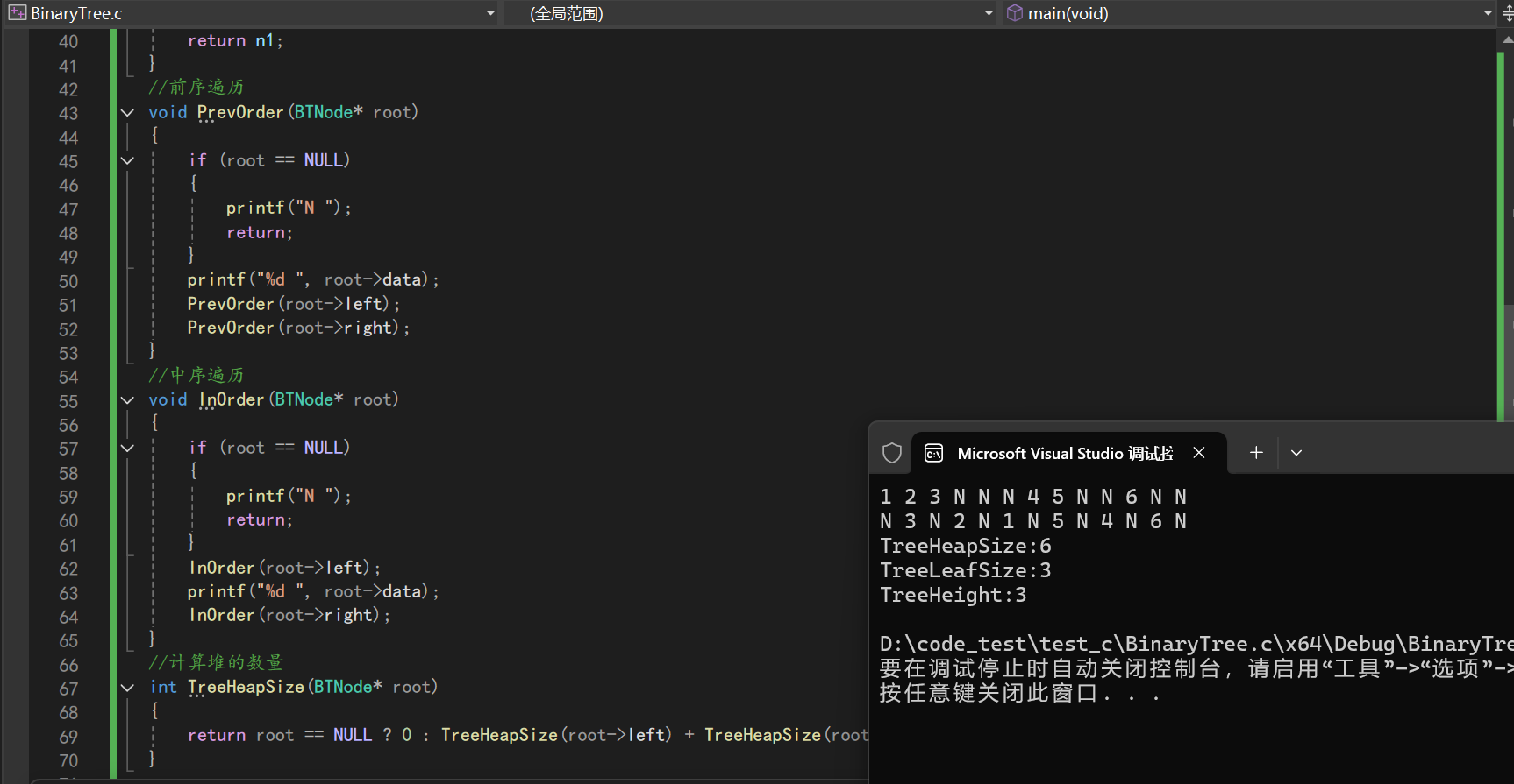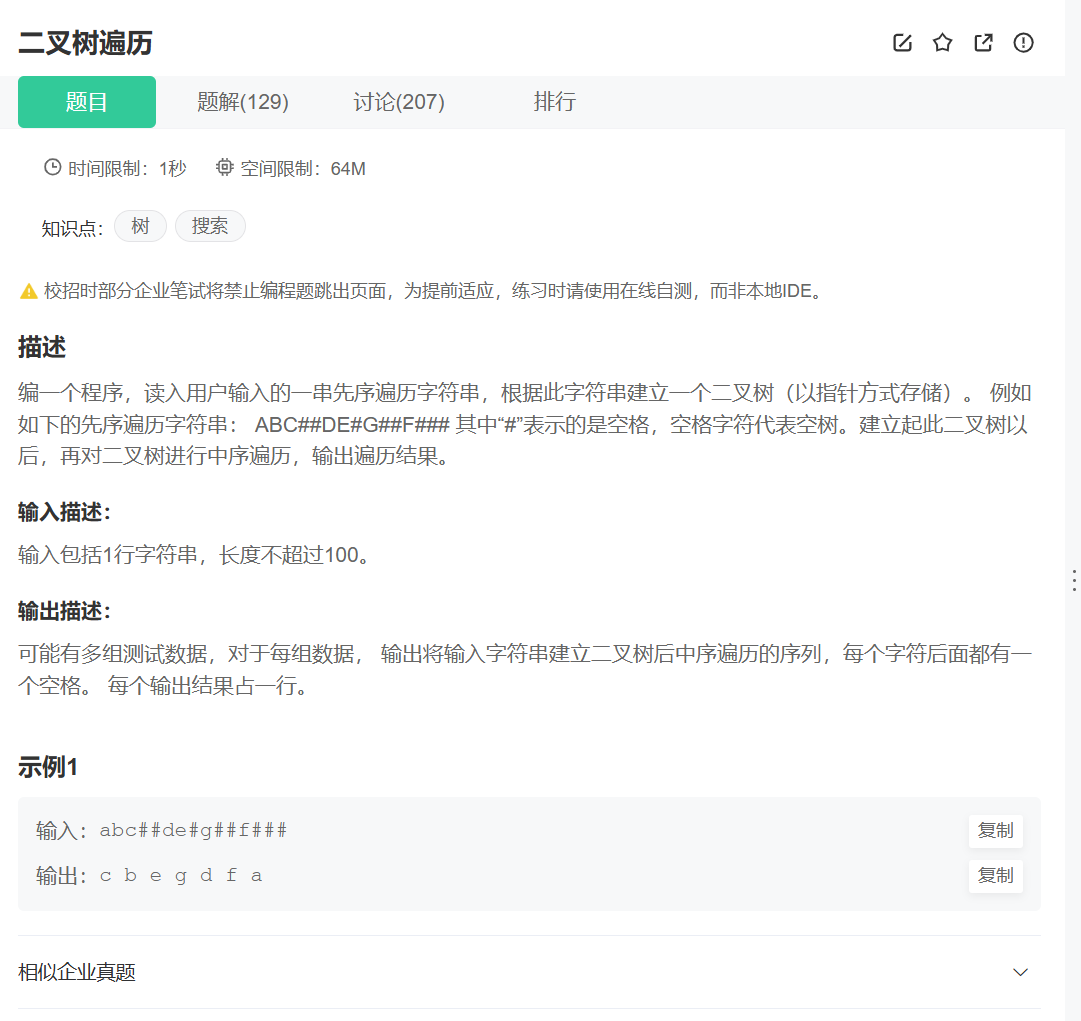 注意:构建二叉树:获取char类型的数组a,a有100个元素,scanf让用户输入,还需要数组下标,主函数中定义i;BTNode*CreateTree(参数传数组和数组元素下标);当数组a为空时(a[(*pi)] == '#'),让(*pi)++变成#后面的值,接着返回NULL;