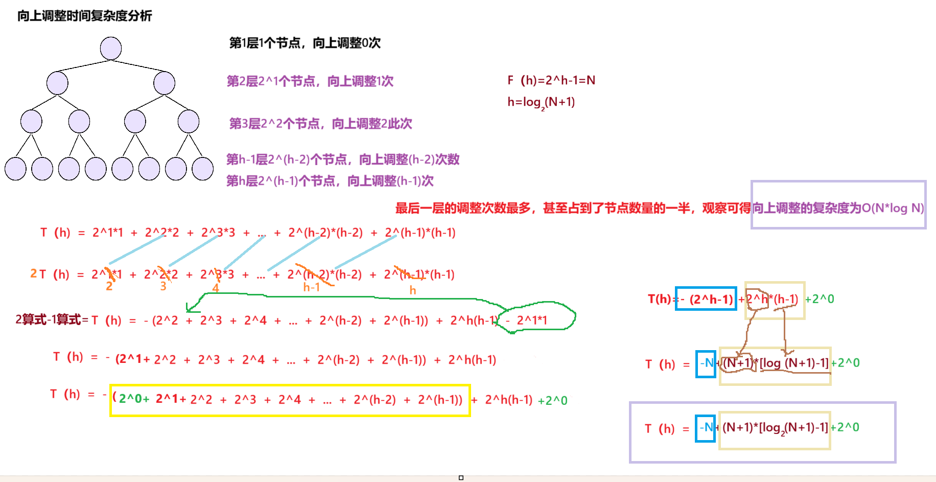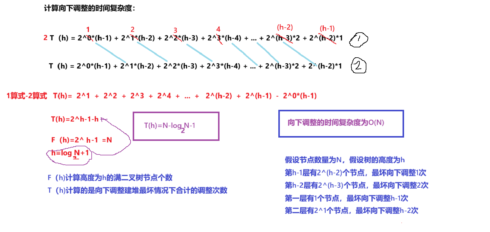 满二叉树F(h)=2^0+2^1+2^2+...+2^(h-1) 等差数列最后算下来是F(h)=2^h-1 假设这棵树是N个节点,F(h)=2^h-1=N h=log(N+1),以2为底 满二叉树:每一层的节点数都达到最大