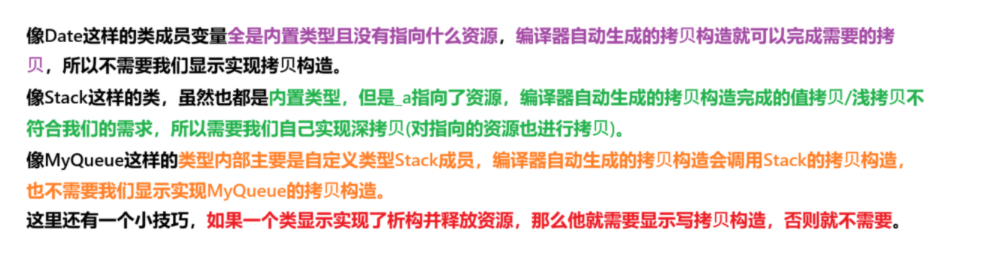 注意:析构函数和构造函数对内置类型不做处理;值拷贝是值是多少就拷贝多少,一个字节一个字节的拷贝,也就是浅拷贝)深拷贝:不仅拷贝值,还拷贝资源。