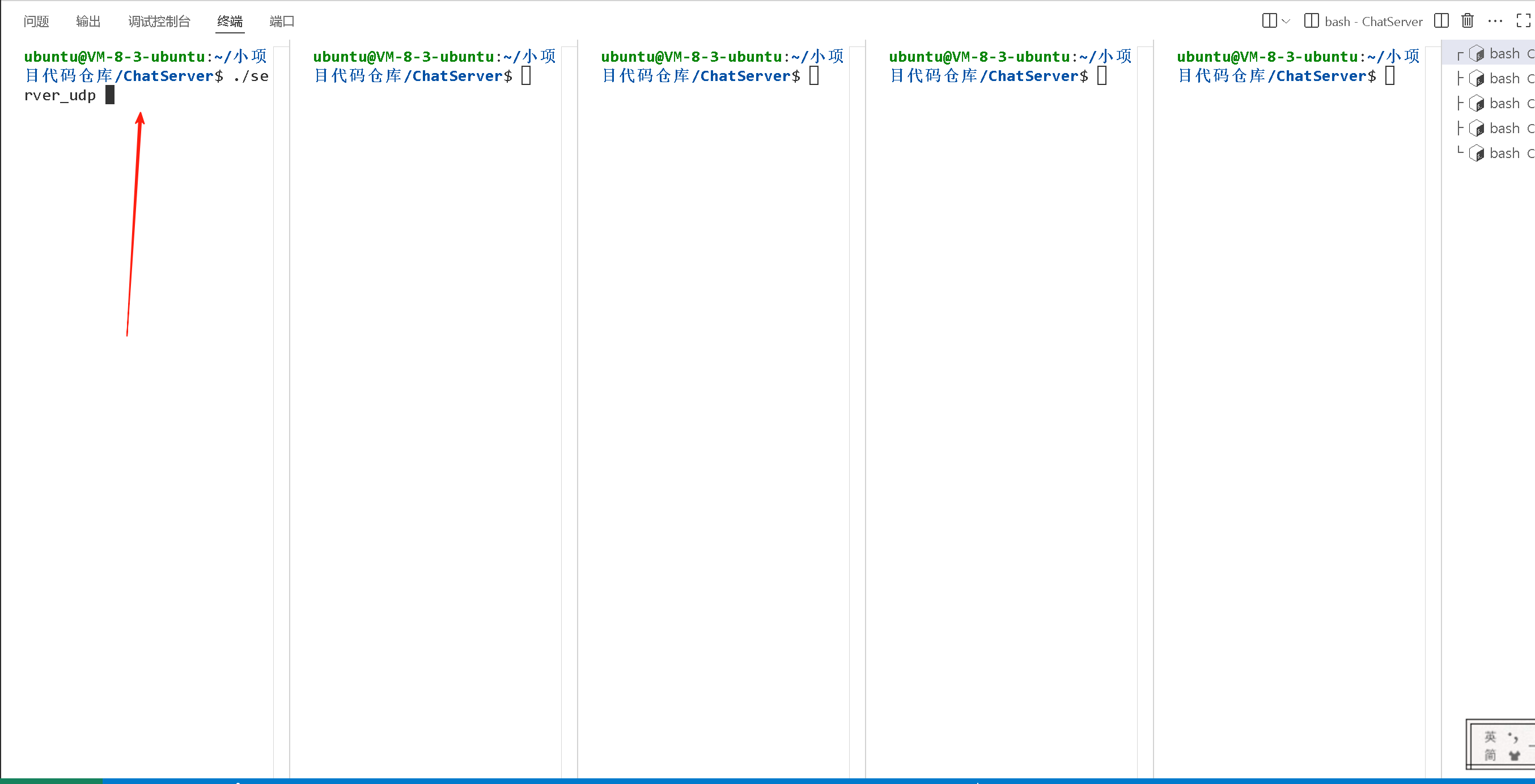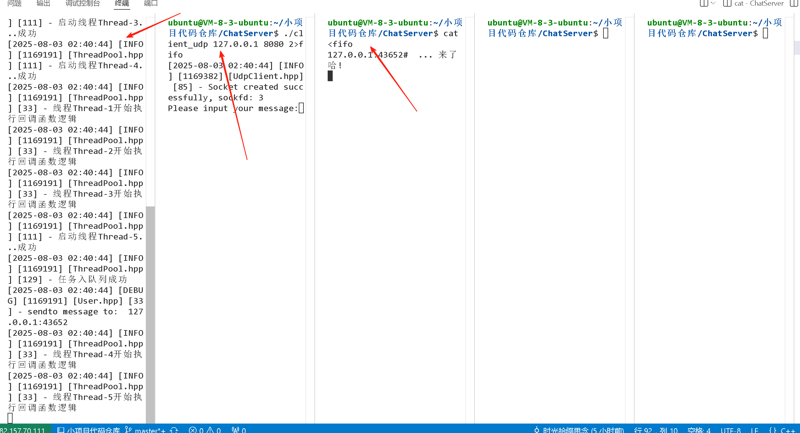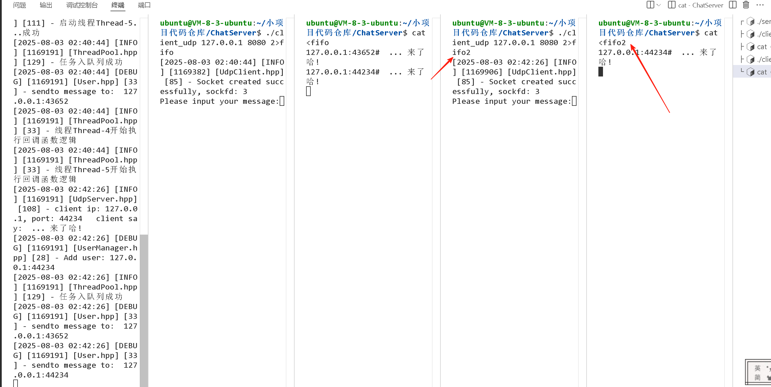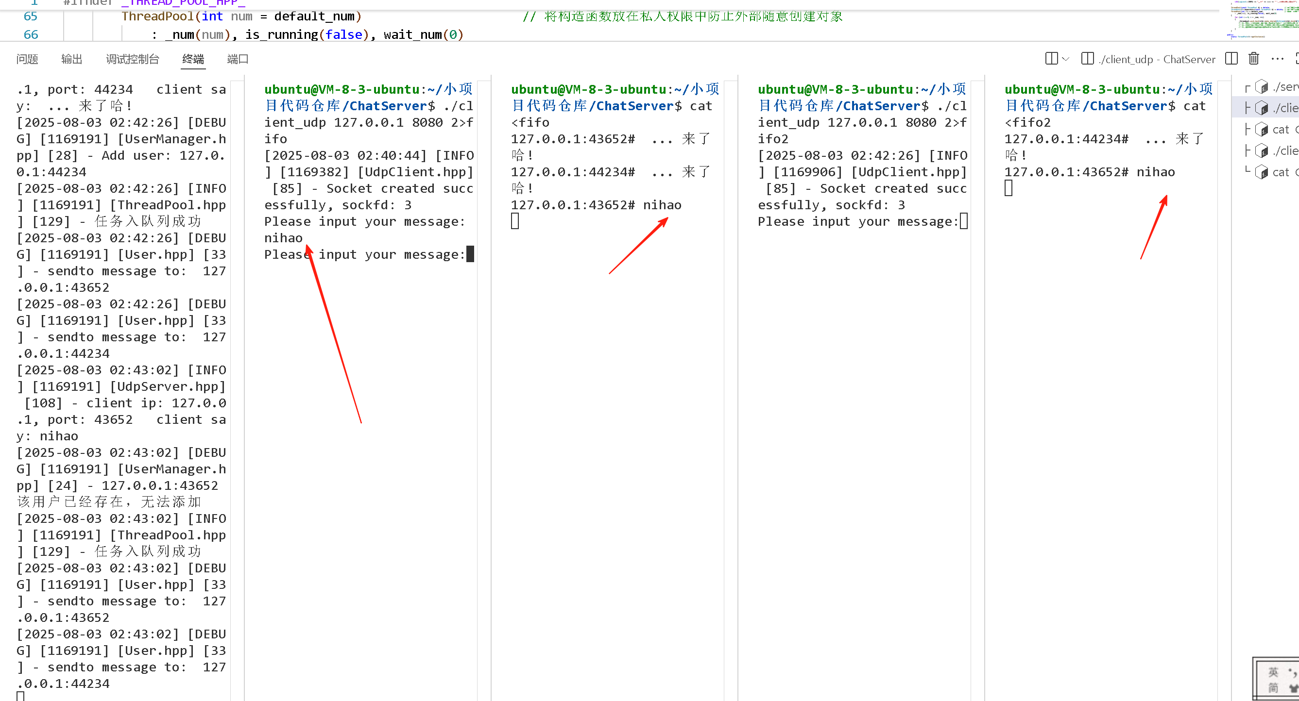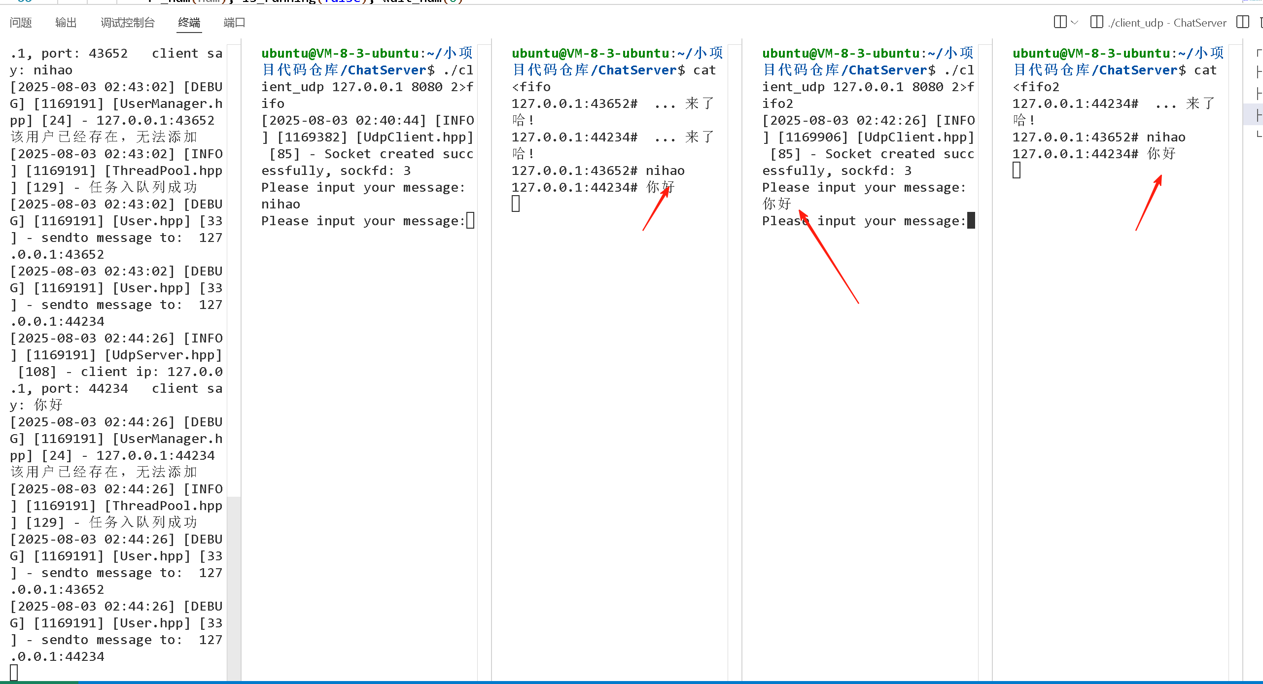 再让用户2输入消息,同样的,其他人都会接收到,并且在聊天框里我们通过ip加端口可以分辨出来。