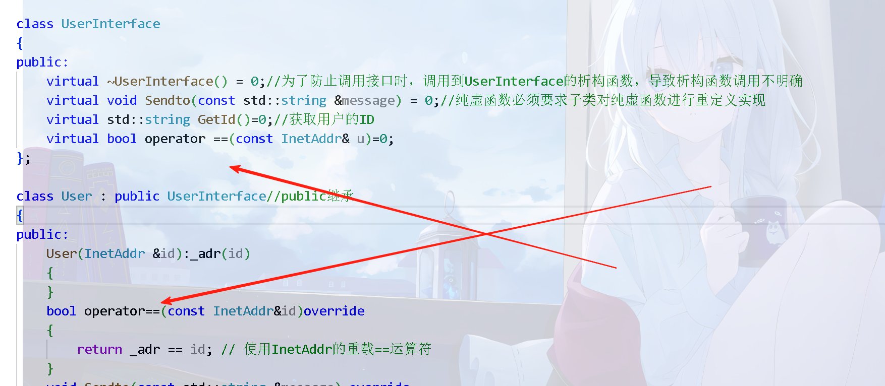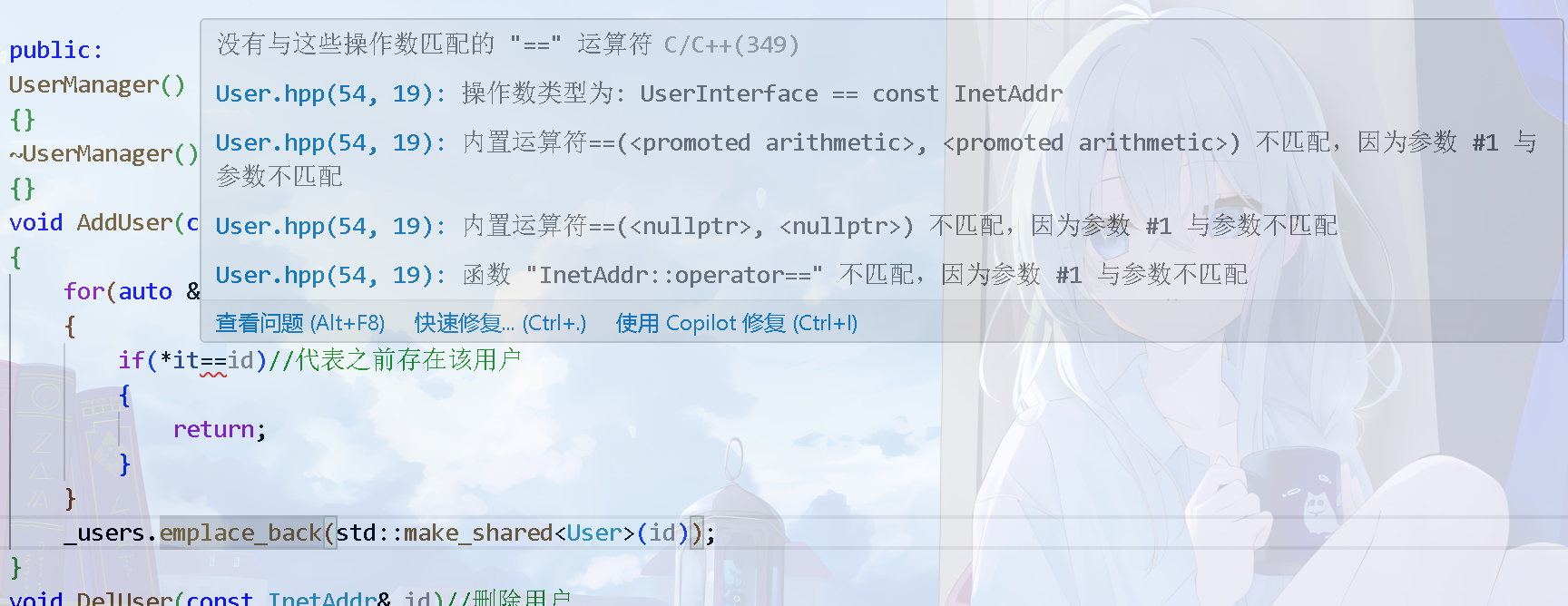 当我们使用*it与传进来InetAddr类型变量id进行比较时,他们两个是一个不同类型的参数,所以我们需要在User及其父类中重载一下相应的==符号: