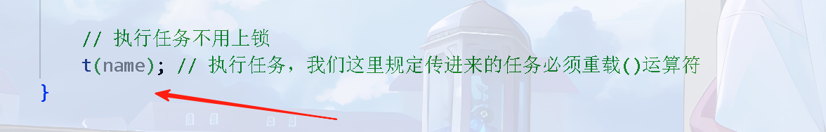 t(); // 执行任务,我们这里规定传进来的任务必须重载()运算符