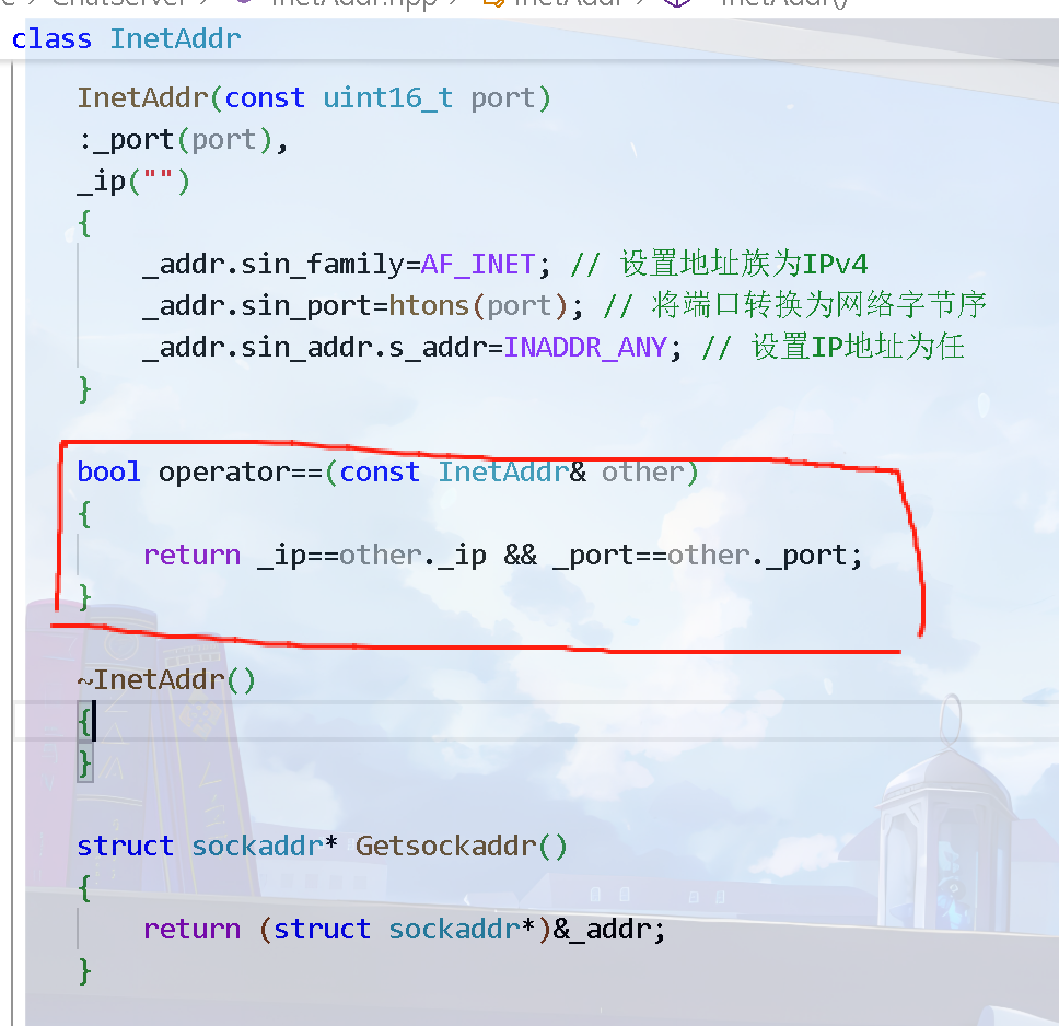 我们这里分别给基类与父类都重载了一个与InetAddr类型做比较的函数。但是我们的InetAddr内部之前并没有重载他的比较好函数,所以我们也需要给InetAddr重载一个: