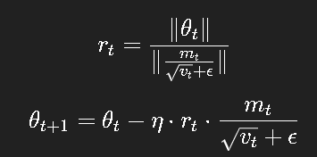 LAMB(Layer-wise Adaptive Moments optimizer for Batch training) 在 Adam 的基础上,对每一层引入了自适应的归一化因子: