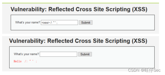 第九步,在XSS(Reflected)页面文本框中输入“<xss> /: " ' ;”,点击“Submit”提交