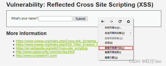 第七步,在XSS(Reflected)界面中,右键点击“查看页面源代码”,查看网页源代码
