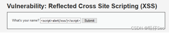 第十一步,在XSS(Reflected)页面文本框中输入注入语句“<script>(/xss/)</script>”,点击“Submit”提交
