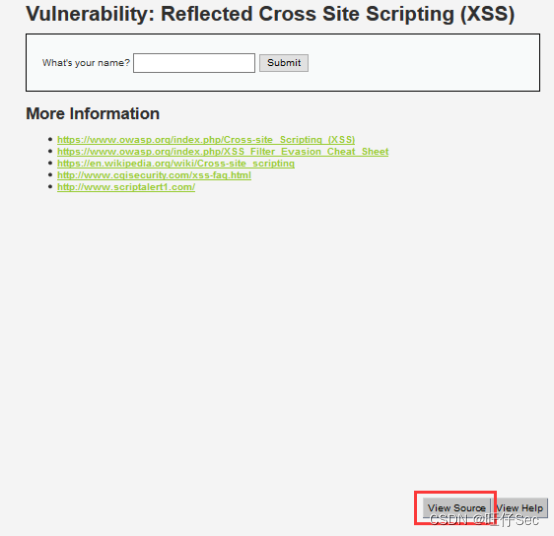 第五步,在导航栏点击“XSS(Reflected)”,能看到一句话,一个文本框以及一个按钮。点击“view source”可以看到本页面的PHP源代码
