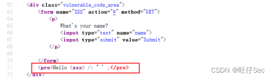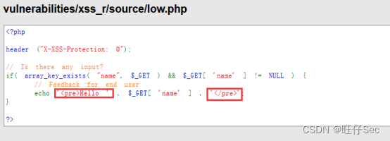第六步,PHP源代码如下,可以理解成PHP脚本中没有做任何的加固;可以借助<pre>……</pre>进行注入。pre元素可定义预格式化的文本,被包围在 pre 元素中的文本通常会保留空格和换行符