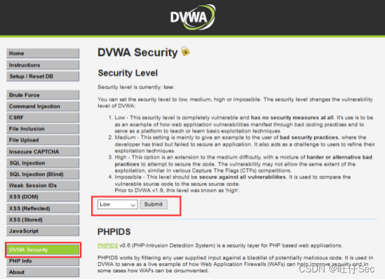 第四步,在DVWA页面点击“DVWA Security” 选择难易程度为“low”,然后点击“Submit”提交