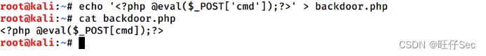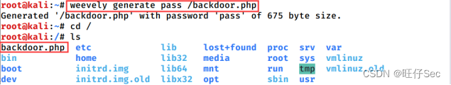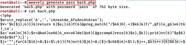 3.通过渗透机Kali Linux2对靶机Windows 7进行文件上传渗透测试,使用工具Weevely在/目录下生成一个木马,木马名称为backdoor.php,密码为pass,该操作使用的命令中固定不变的字符串作为Flag值提交;