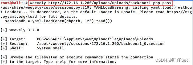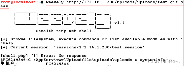5.通过渗透机Kali Linux2对靶机Windows 7进行文件上传渗透测试(使用工具Weevely,连接目标服务器上的木马文件),连接成功后将目标服务器主机名的字符串作为Flag值提交;