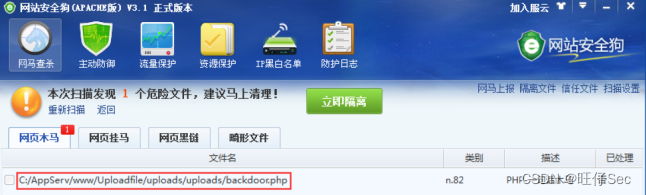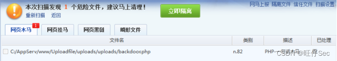 因为第一次上传的一句话木马并没有清除,所以还是可以检测出木马的存在