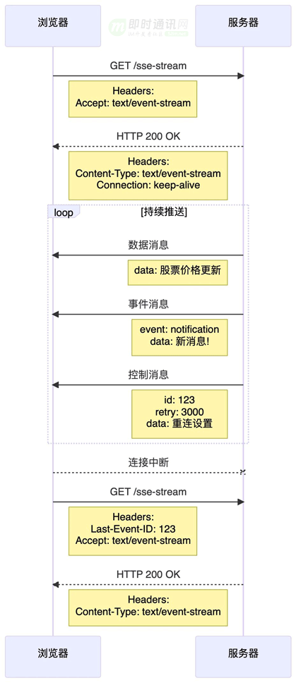 2)响应格式:服务器返回 Content-Type: text/event-stream,然后持续发送数据