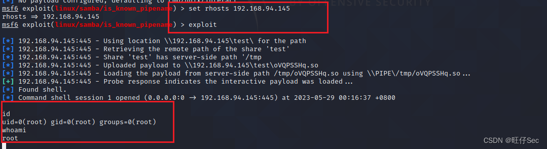 重新使用溢出模块对靶机的smb服务进行溢出操作,使用命令rexploit