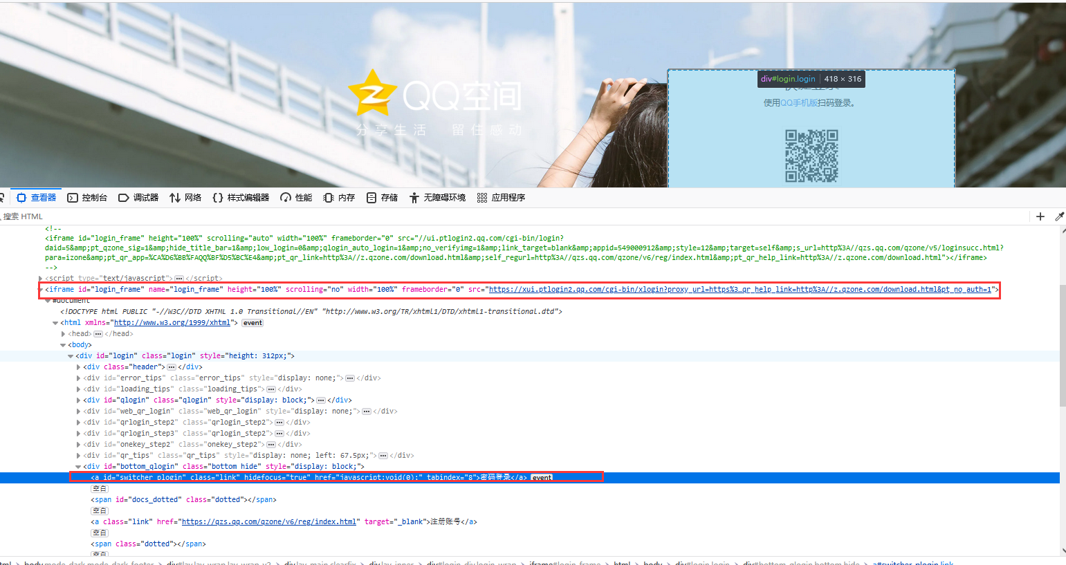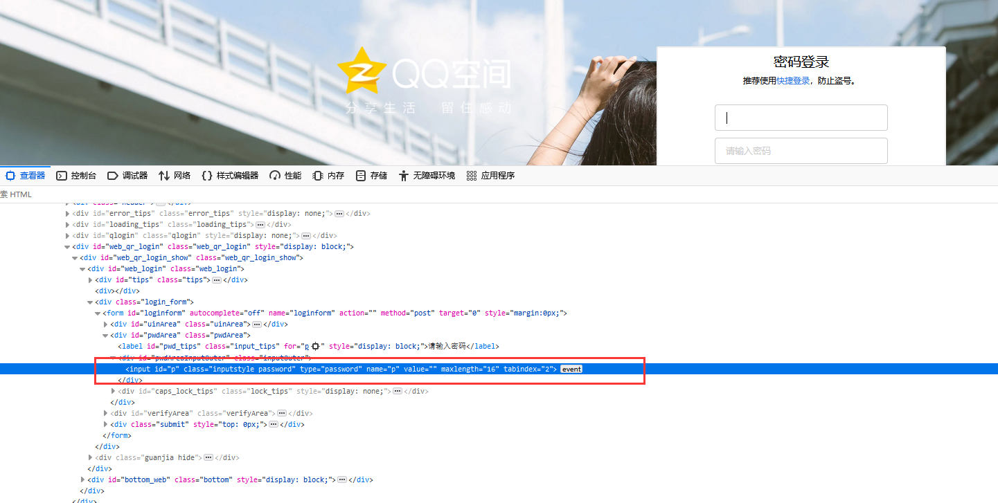 点击密码登录后显示qq号输入框与密码输入框,我们可以查看网页元素结构,查看两个输入框的定位元素