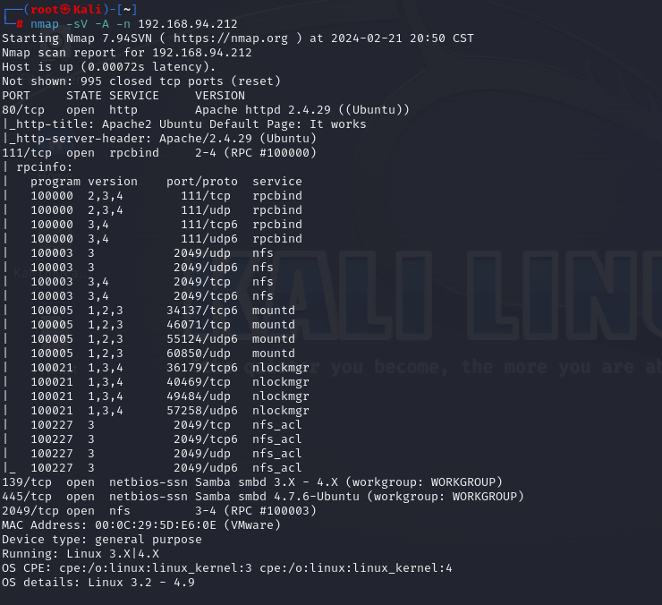 发现靶机IP之后,直接上Nmap扫描!发现靶机开放了80、111、139、445、2049nfs几个端口