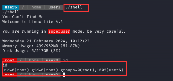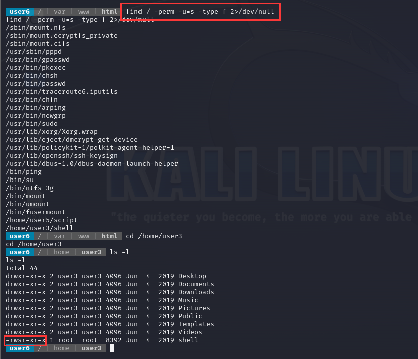 find / -user root -perm -4000 -print 2>/dev/null接下来我们可以使用命令来查找具有suid权限的可执行文件,发现在/home/user3目录存在一个shell,进行此目录查看权限发现存在s标志出现在x权限上面,那么我们可以确定这个文件可以进行提权。