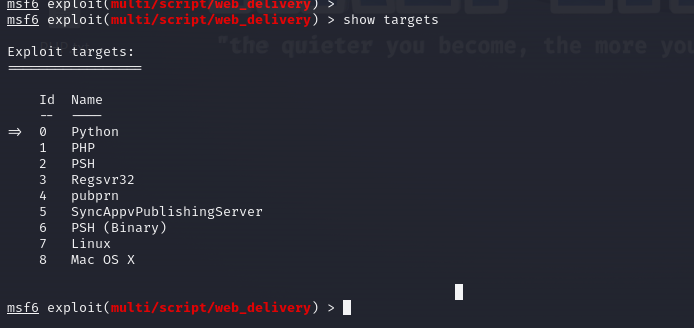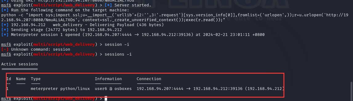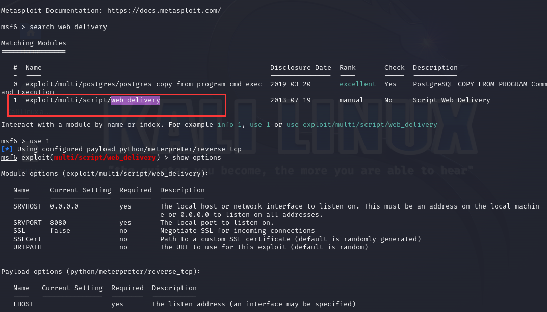 打开msfconsole控制台使用web_delivery漏洞攻击模块