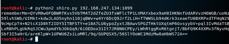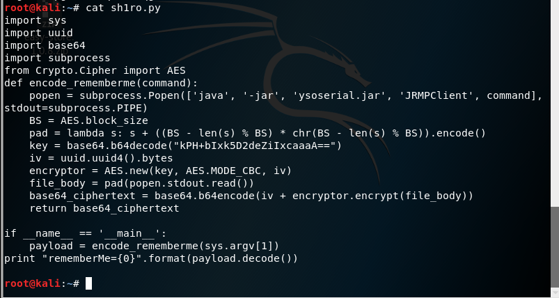 让存在漏洞的页面去请求我们攻击机的VPS服务暨对攻击机kali 192.168.247.134:1088进行请求,因此,我们要用脚本对192.168.247.134:1088进行AES加密=>Base64编码,我们可以生成一个加密脚本,shiro.py代码如下。注意!这是一段Python2才能运行的!!