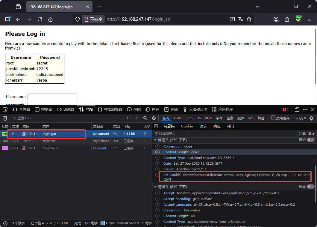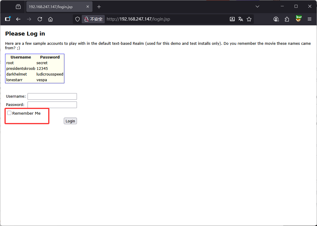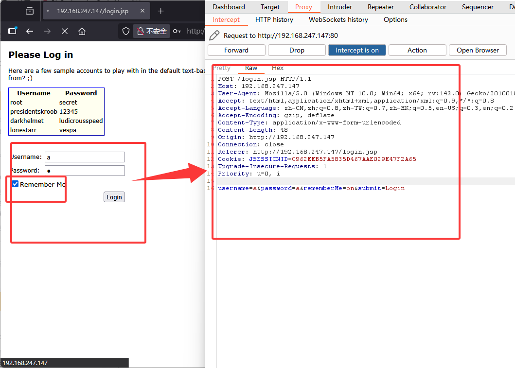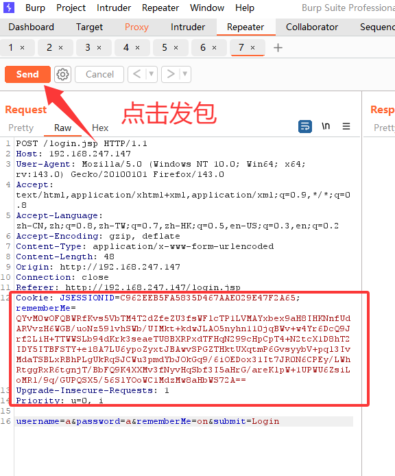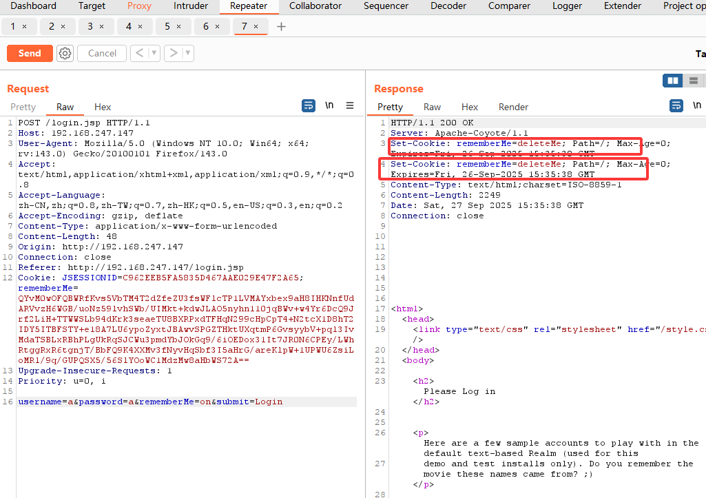 查看登录的数据包,发现请求包中存在着remember me字段,返回包中有