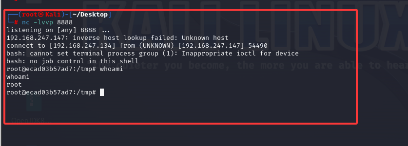 命令解释:在本机 1099 端口启动一个 JRMP 监听器,当目标服务器反序列化 JRMPClient 类型的 payload 并连接到你时,自动下发 CommonsCollections4 利用链,最终让目标执行一段 base64 包裹的 bash 反弹 shell,把 shell 弹回你的 8888 端口。