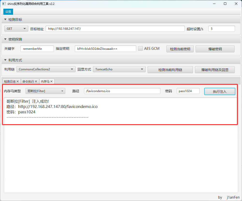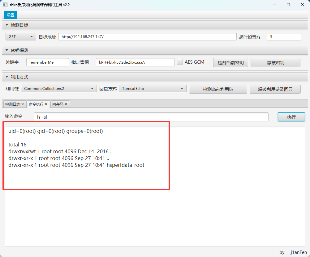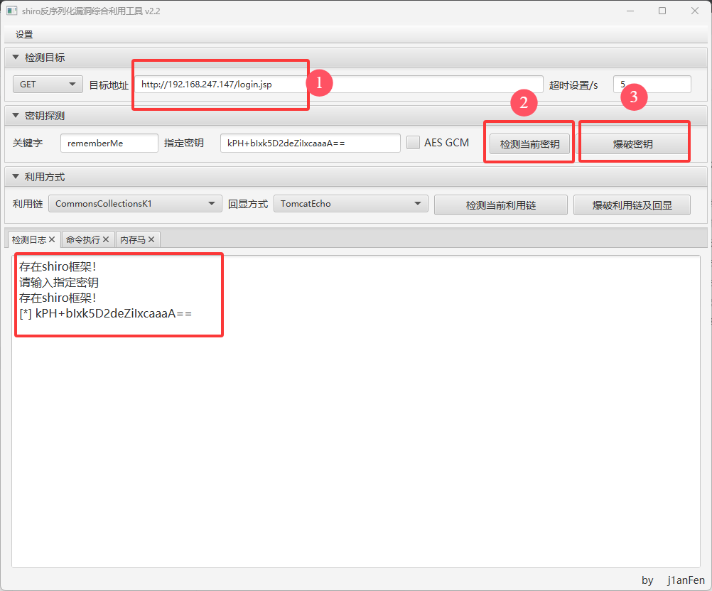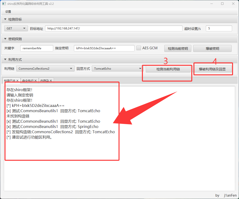 可以看到检测日志模块,出现了“存在shiro框架”,并成功爆出了密钥kPH+bIxk5D2deZiIxcaaaA==,继续点击“检测当前利用链”、“爆破利用链及回显”,就可以看到检测日志模块,出现了“发现构造链:xxxx 回显方式:xxx”,并提示我们请尝试功能区利用: