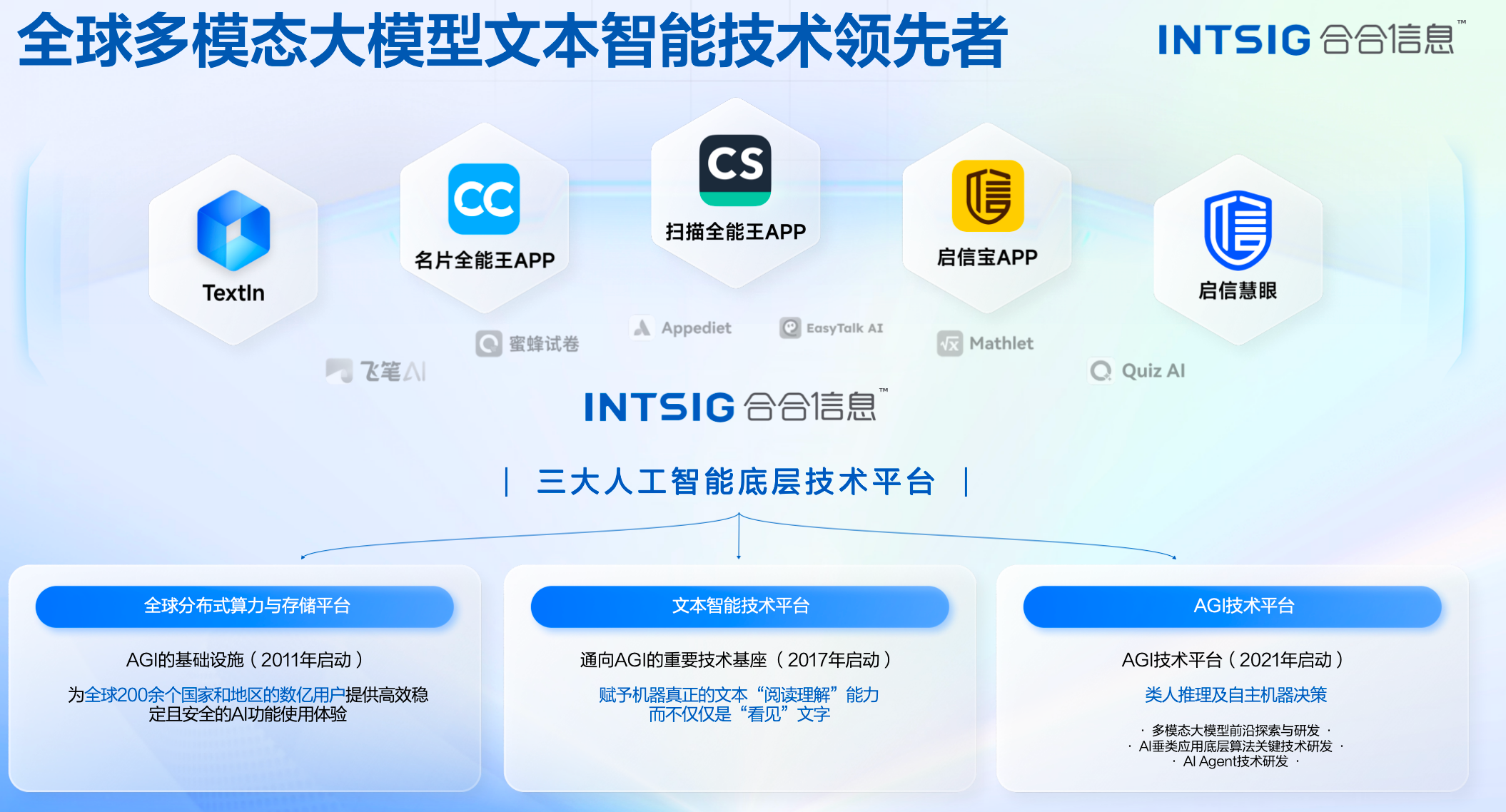 从底层视觉处理到文档解析,再到内容安全防护,合合信息在多模态文本智能技术的各个环节都展现出了扎实的技术积累。但这些单点技术的突破,并非孤立存在的。它们的背后,是合合信息多年来构建的三大人工智能底层技术平台在提供支撑。合合信息技术具有三大创新平台:全球分布式算力与存储平台、文本智能技术平台、AGI技术平台。