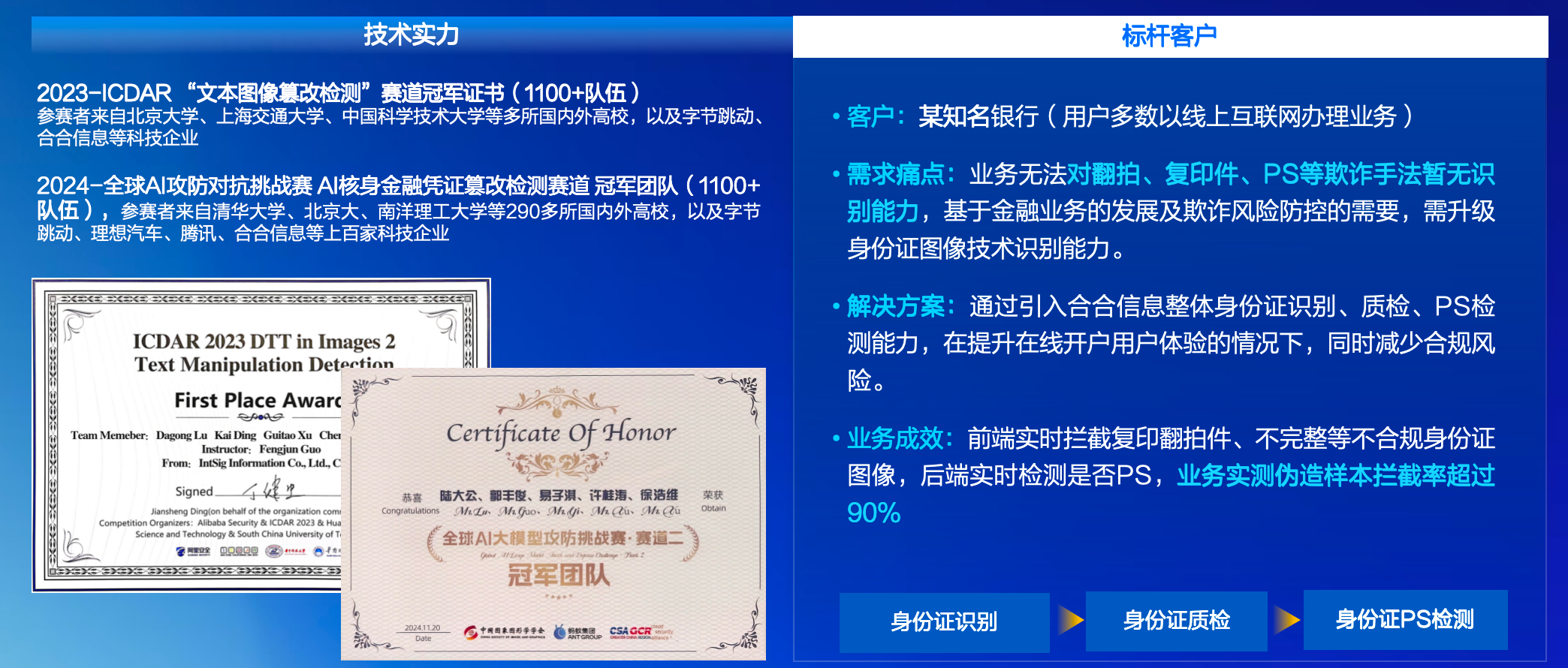 合合信息技术团队近年来在多项国际顶级赛事中斩获佳绩,包括ICDAR2023"文本图像篡改检测"赛道冠军,2024全球AI攻防对抗挑战赛"AI核身金融凭证篡改检测"赛道冠军,CVPR2024第五届ChaLearn活体检测挑战赛第三名等。