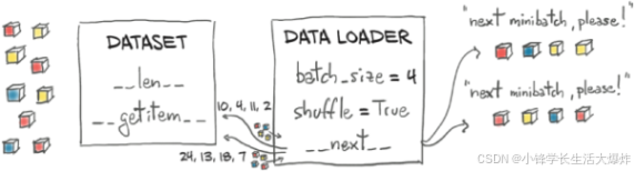 数据加载器(DataLoader) 将数据集(dataset)与采样器(sampler)结合起来,并提供一个可迭代对象,用于遍历给定的数据集。torch.utils.data.DataLoader 支持 map-style(映射式) 和 iterable-style(可迭代式) 两种数据集,支持单进程或多进程加载,可以自定义加载顺序,并可选择是否自动分批(collation)以及是否将数据固定到内存(pinning)。