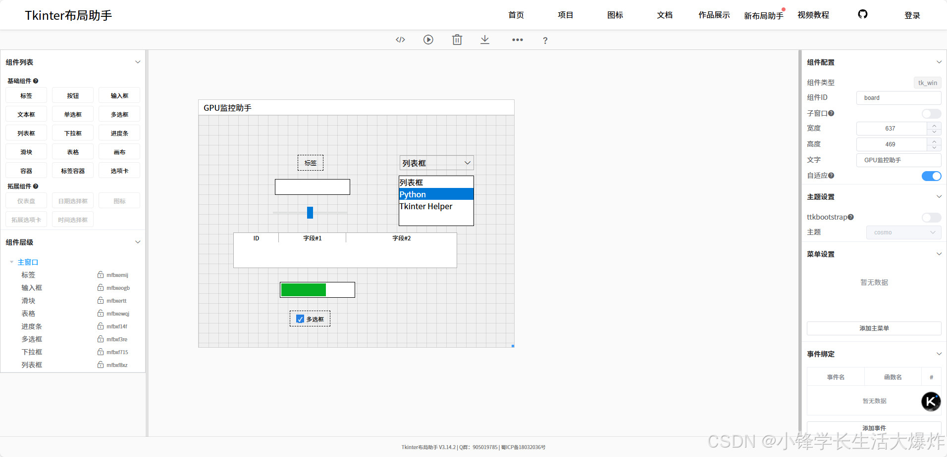 在线网页版本,免安装,基于python内置tkinter,很轻量。 虽然组件不多,不过作者还在开发中。 对于一些比较简单、美化要求不高的项目,我比较推荐。