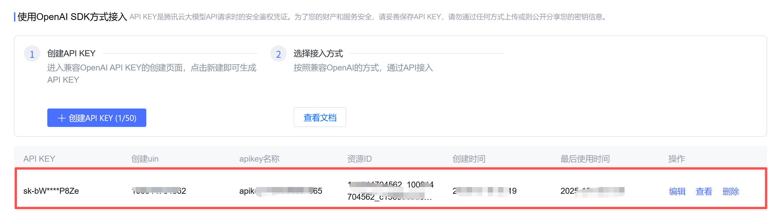 3. 如果选择【使用OpenAI SDK方式接入】,则点击【创建API KEY】进入兼容OpenAI API KEY的创建页面,点击新建即可生成API KEY,编辑apikey名称,确定即可。