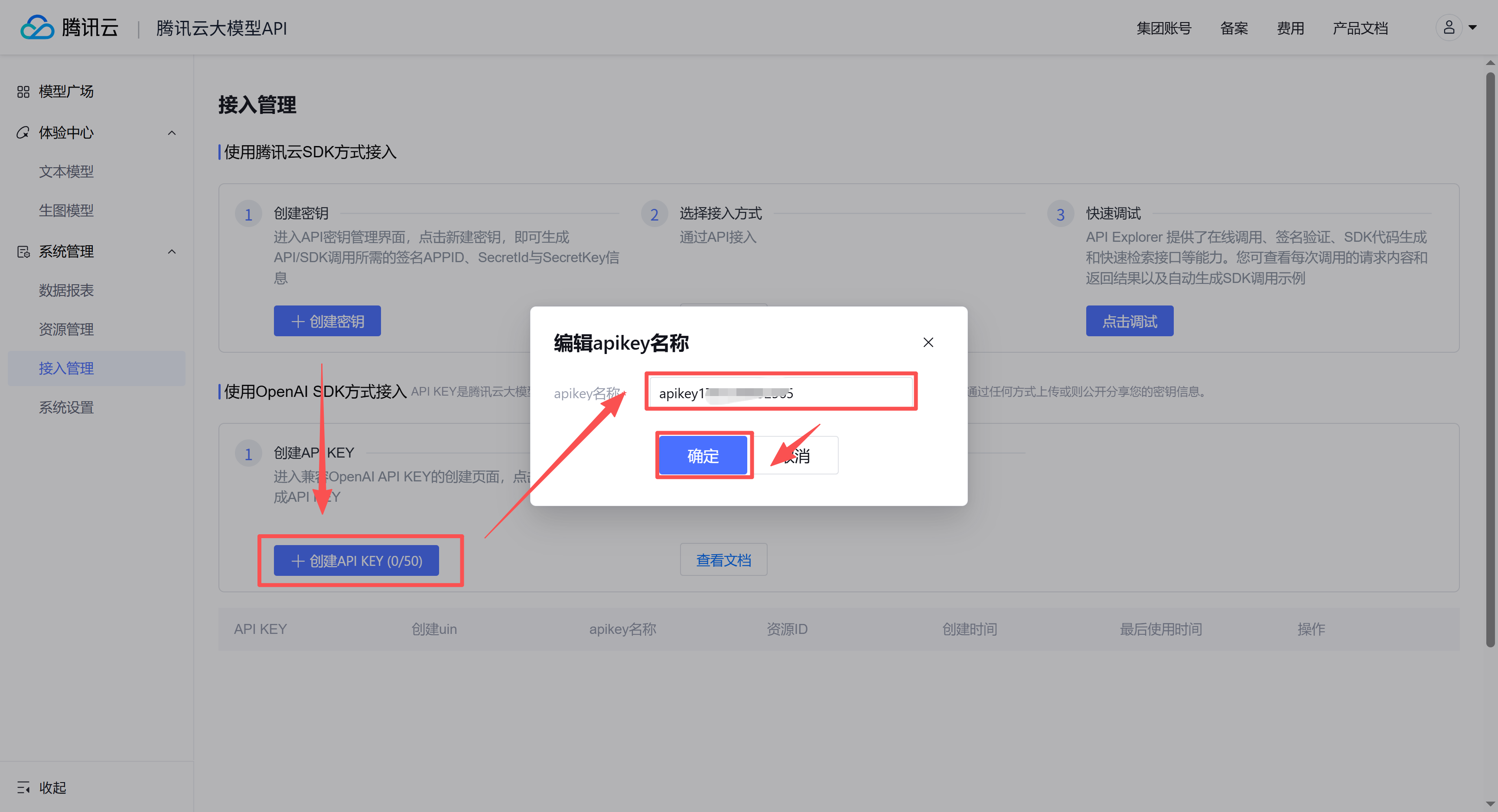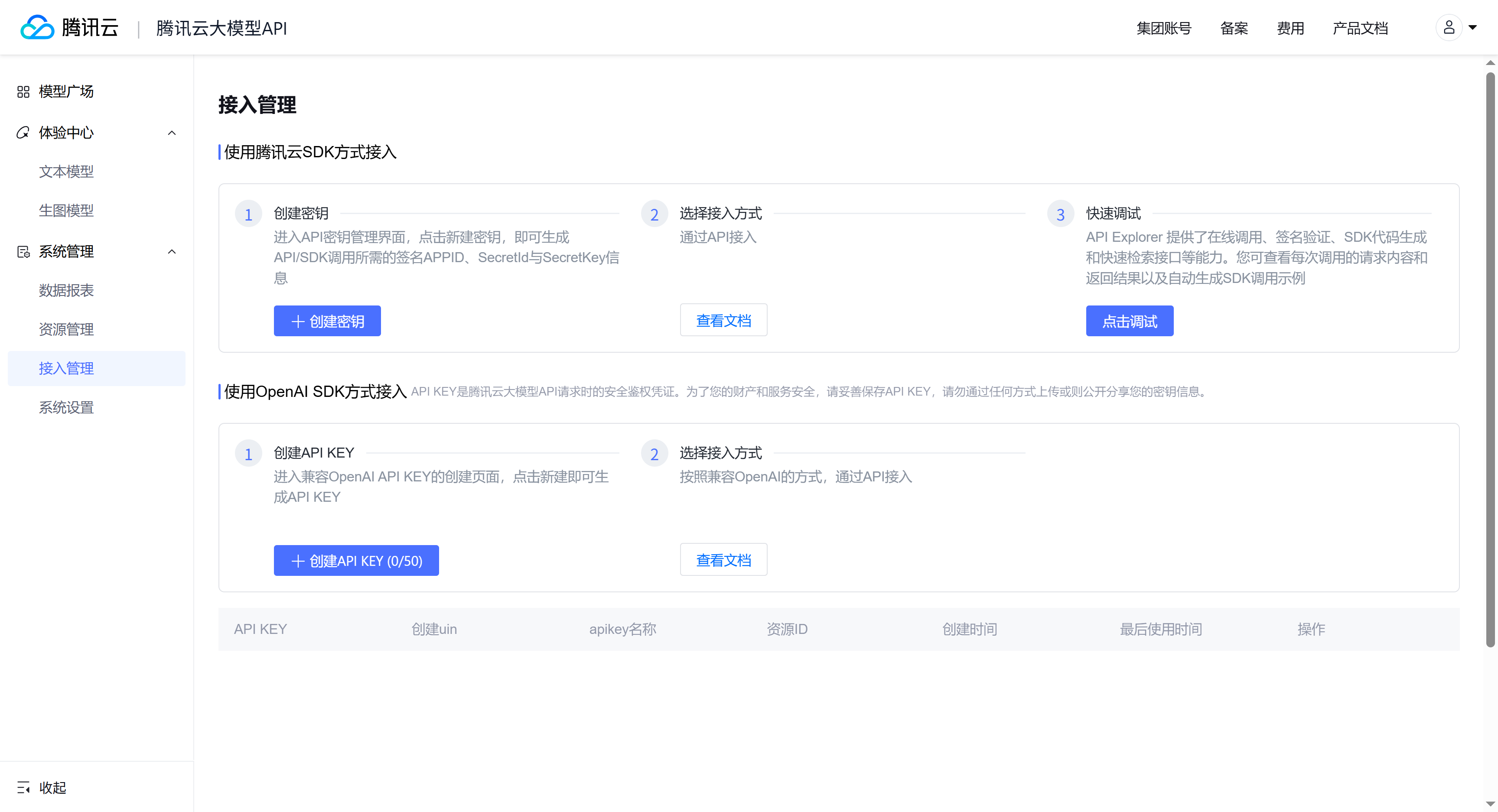 1.首先登录腾讯云大模型API的管理后台,申请API-key;