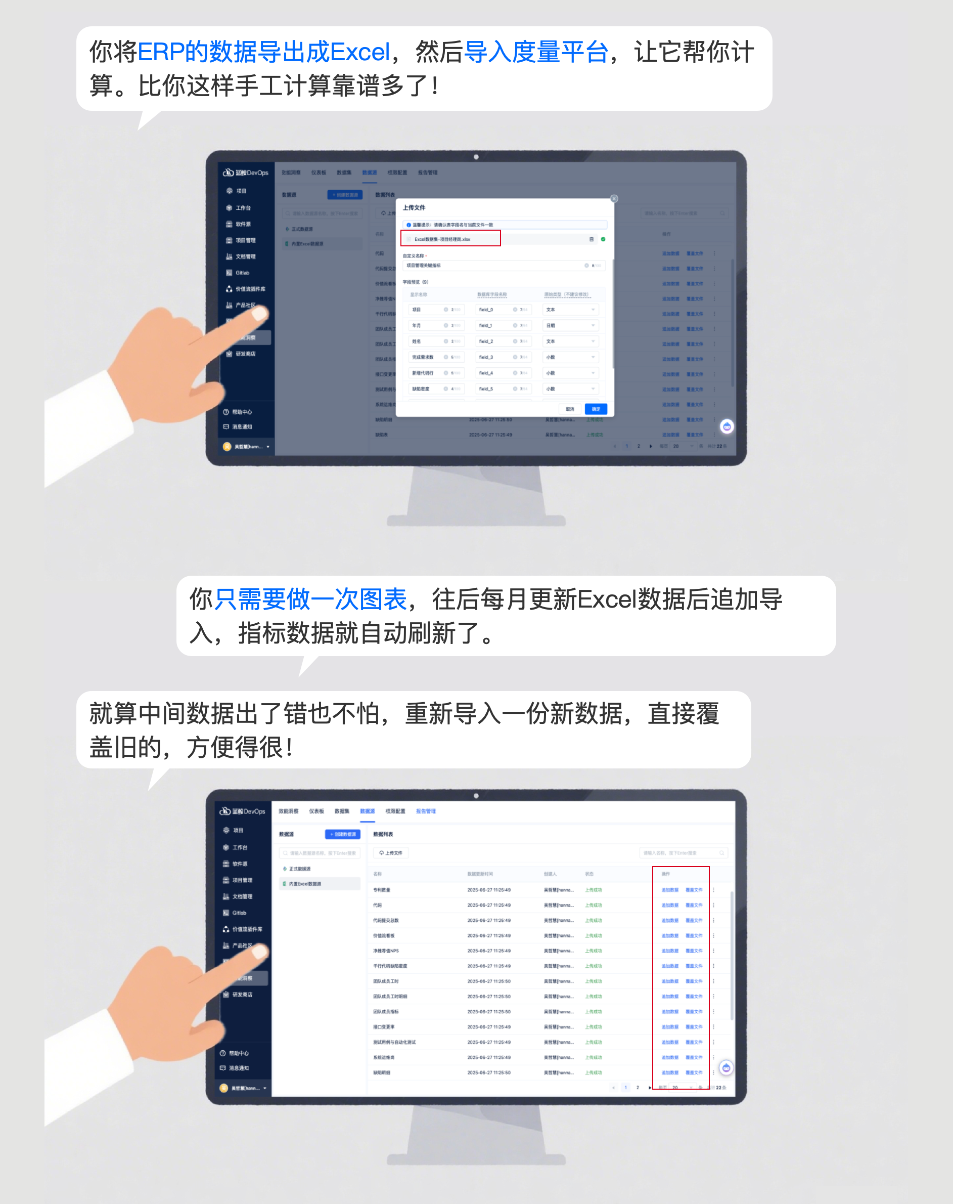 嘉为蓝鲸效能洞察平台·CMeas实现可度量离线Excel数据;后续通过简单导入、追加即可更新数据,无需重复制作图表,助力洞察数据采集更高效!